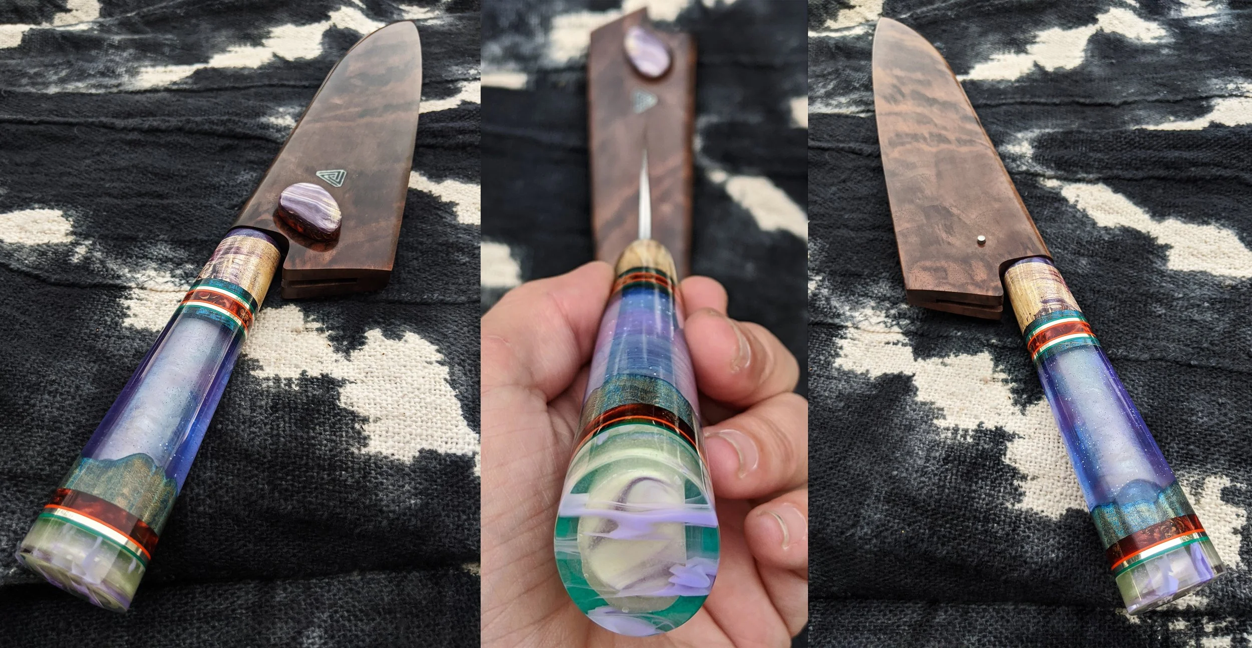 But it doesn't stop there. I always have something new up my sleeve. For the last couple of years I've been experimenting with adding a glow feature to my work and I think I finally figured it out with pigment powder and the art of refraction. As I mentioned previously, Elena's name in the Ho-Chunk Nation is Haahemaani which translates to “walks at night”. So I thought what better way to bring realness to this entire piece, than by making the night sky in the handle glow like the milky way. Now, she who "walks at night" has light as her guide. And better yet, you can watch her use it to fight her way through the ranks with Michael Voltaggio on her team on Season 5 of Food Network’s BBQ Brawl filmed just down the road at Star Hill Ranch right outside of Dripping Springs, Texas.